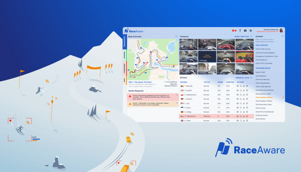 RaceAware is a series of standalone software and hardware solutions when combined provide in-field geo-location services, micro ECG reporting, toggleable video feeds and communication feeds.